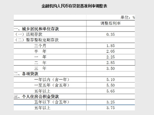 央行決定,自2015年5月11日起下調(diào)金融機(jī)構(gòu)人民幣貸款和存款基準(zhǔn)利率。金融機(jī)構(gòu)一年期貸款基準(zhǔn)利率下調(diào)0.25個百分點至5.1%;一年期存款基準(zhǔn)利率下調(diào)0.25個百分點至2.25%,同時結(jié)合推進(jìn)利率市場化改革,將金融機(jī)構(gòu)存款利率浮動區(qū)間的上限由存款基準(zhǔn)利率的1.3倍調(diào)整為1.5倍;其他各檔次貸款及存款基準(zhǔn)利率、個人住房公積金存貸款利率相應(yīng)調(diào)整。